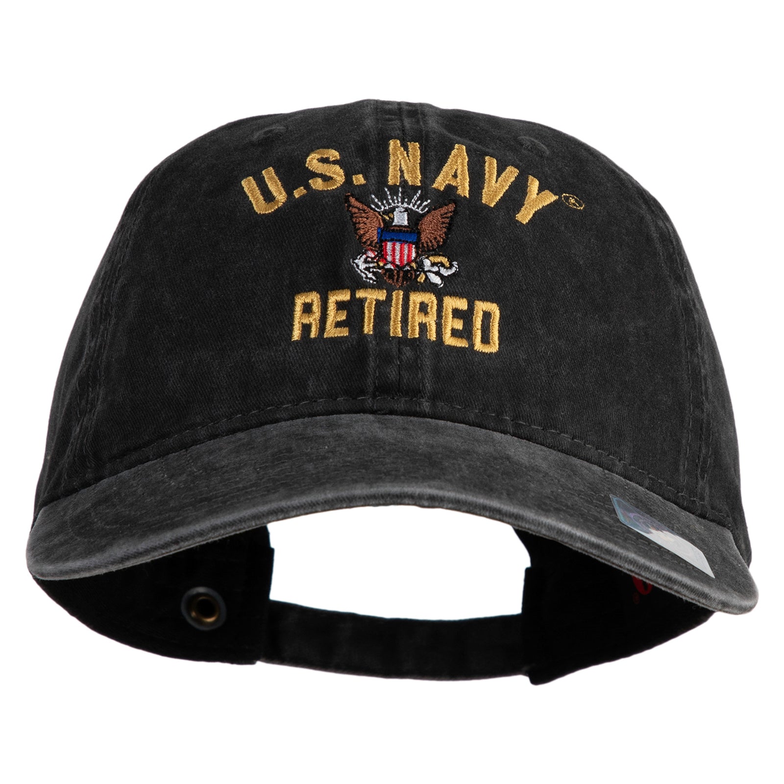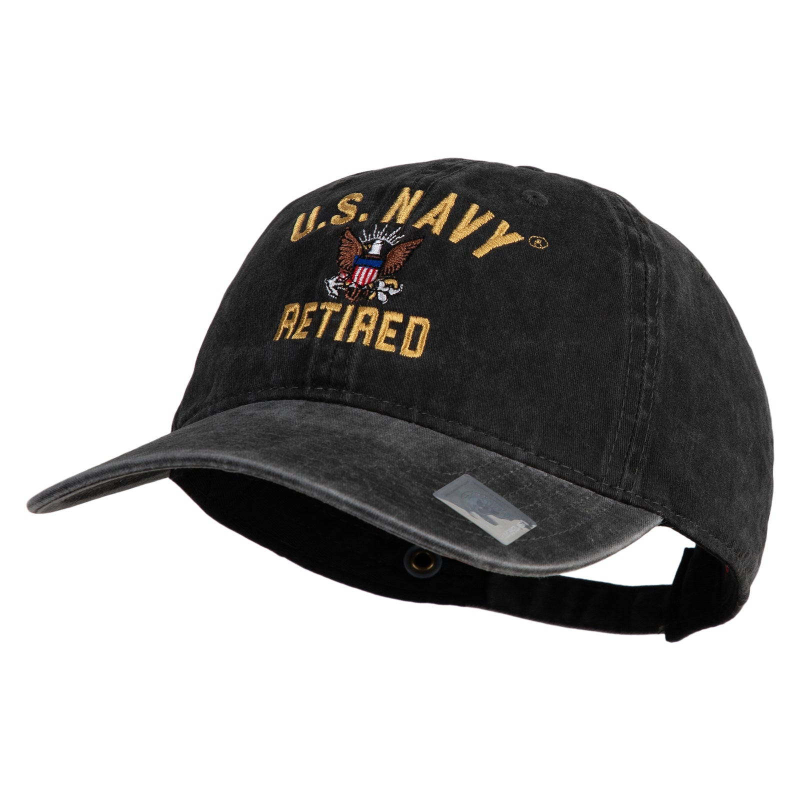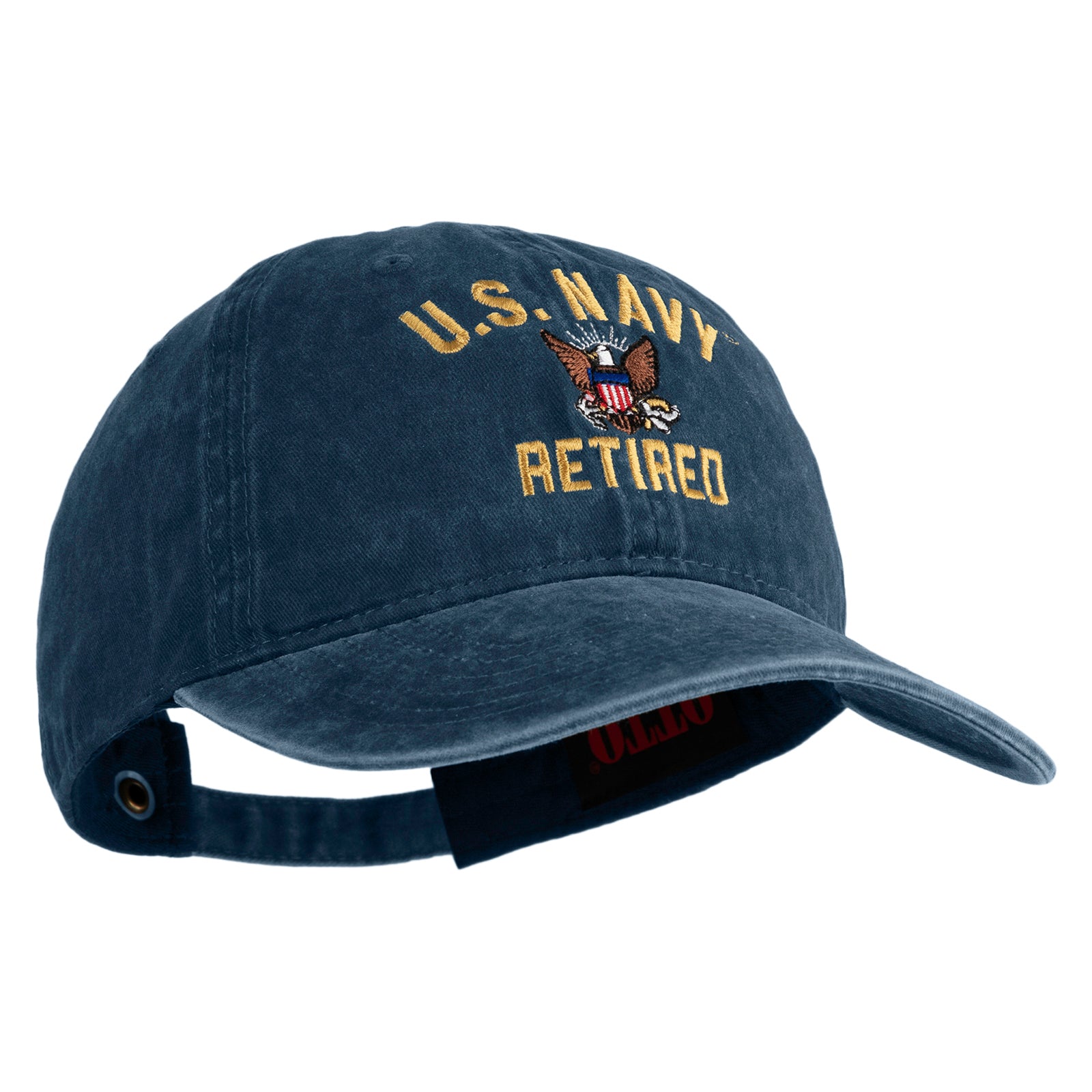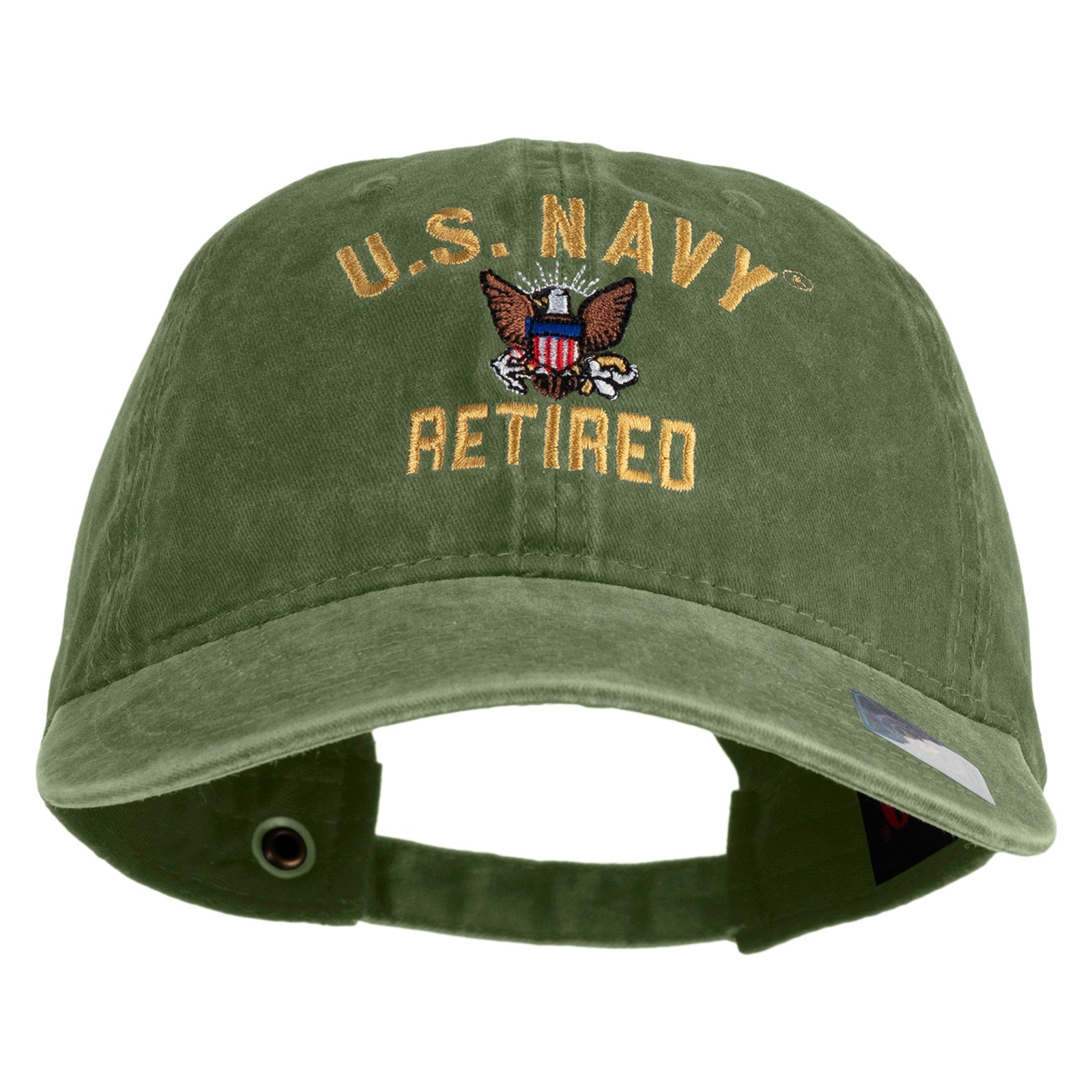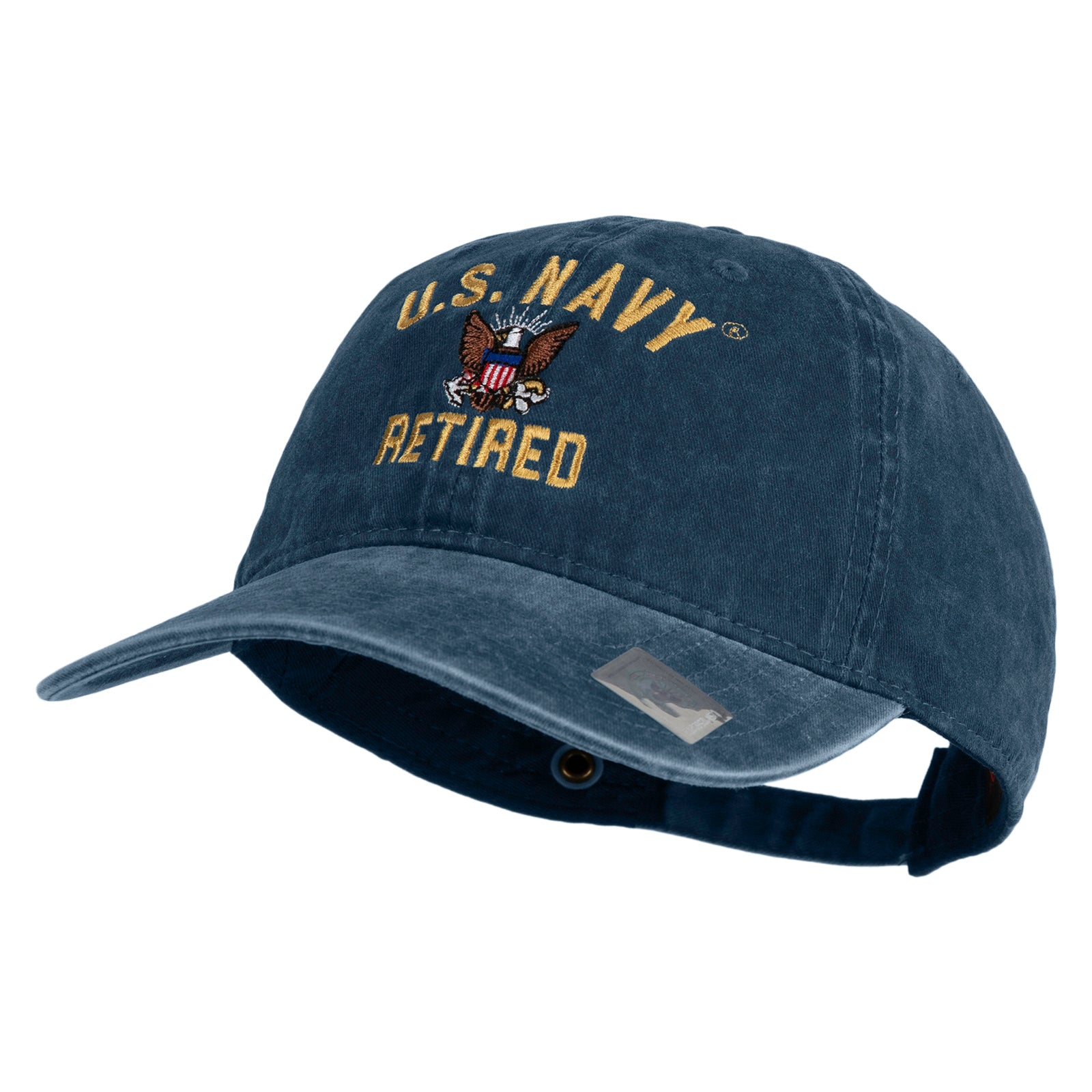 Title, US Navy Retired Embroidered Washed Solid Pigment Dyed Cotton Twill Brass Buckle Cap