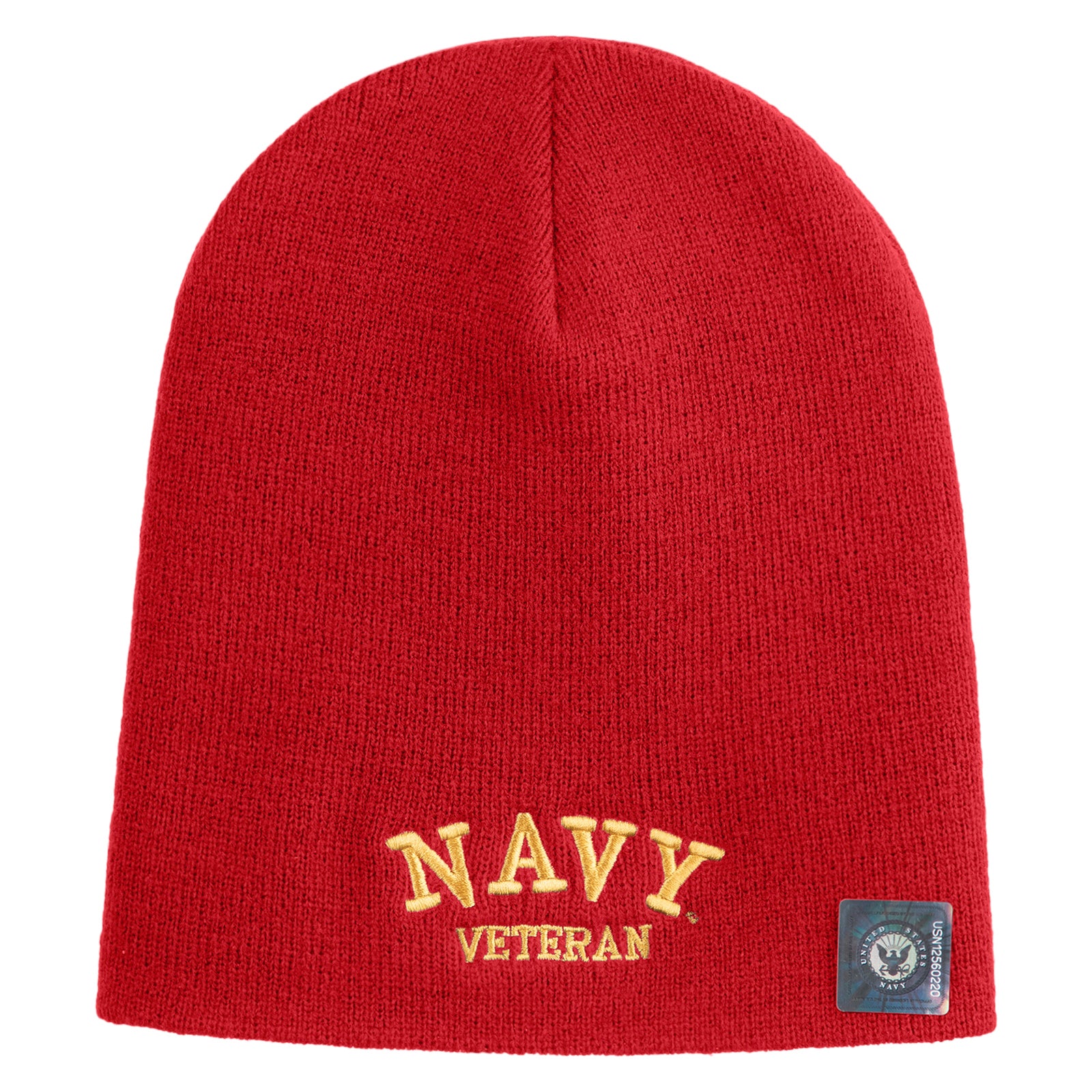 Navy Veteran Letters Symbol Embroidered Heavyweight Classic Knit Short Beanie - Red OSFM