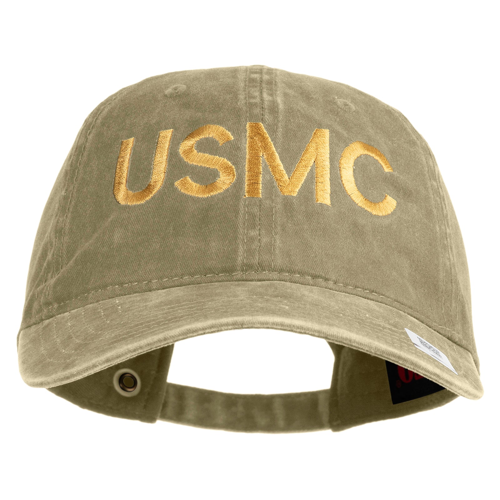 USMC Letter Embroidered Washed Solid Pigment Dyed Cotton Twill Brass Buckle Cap - Khaki OSFM