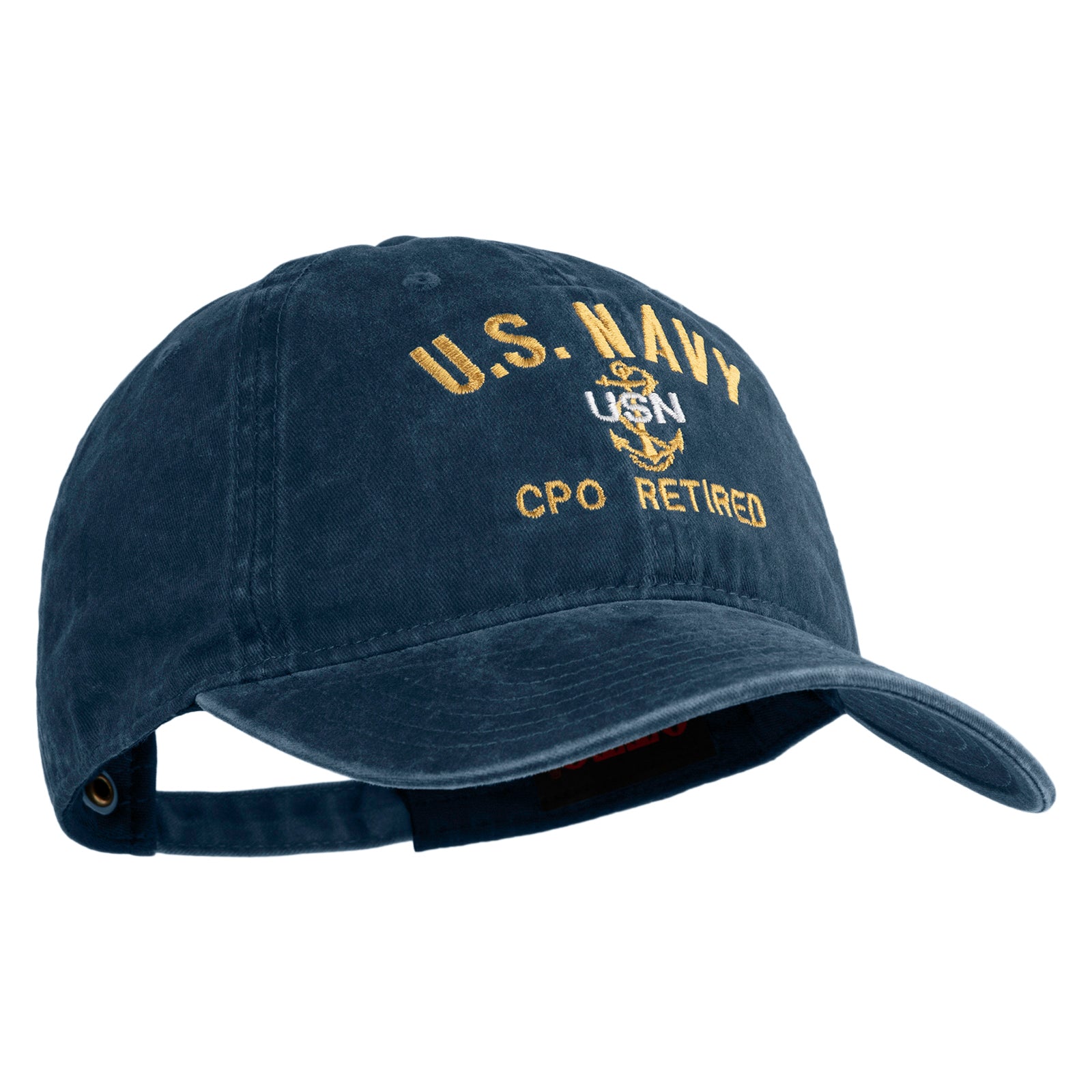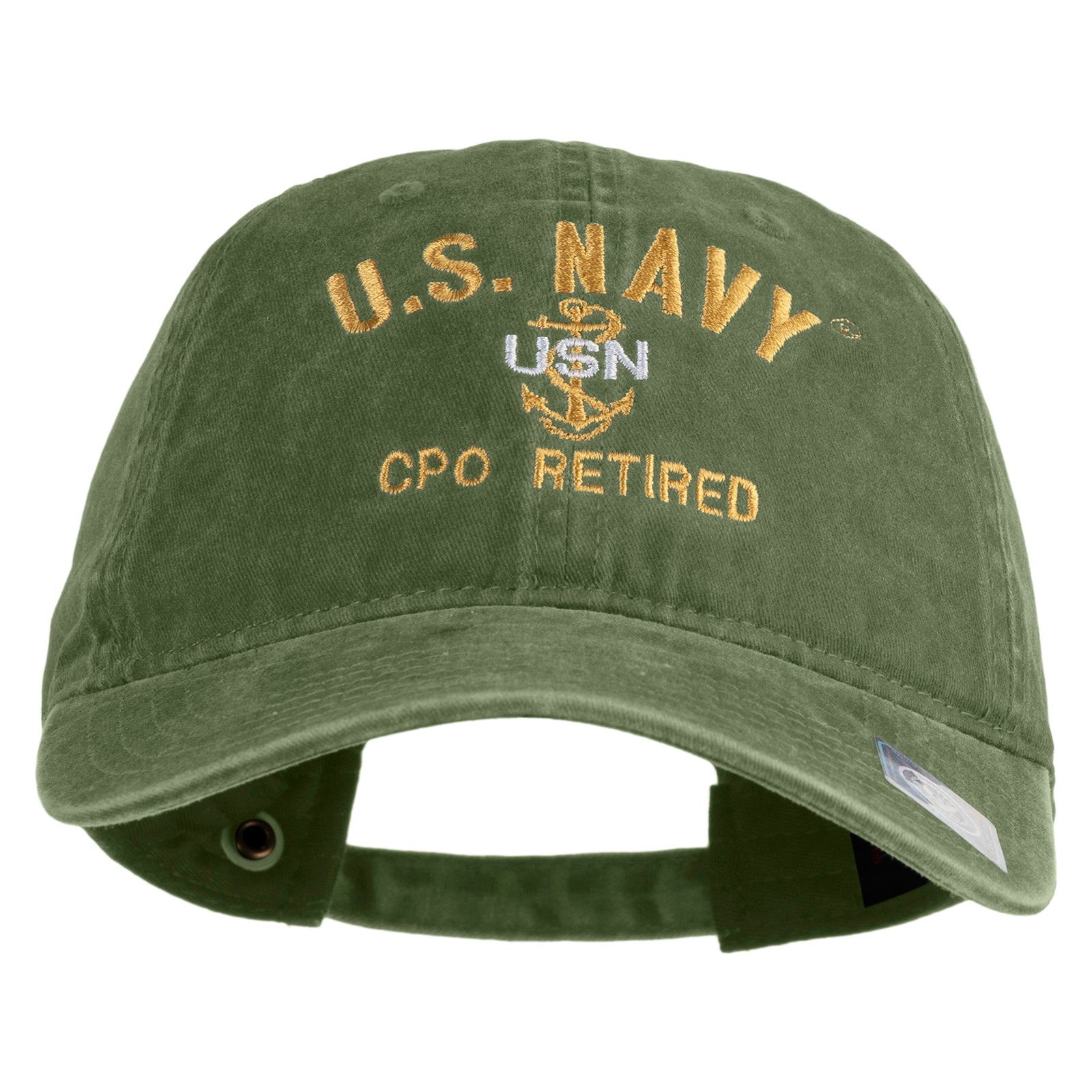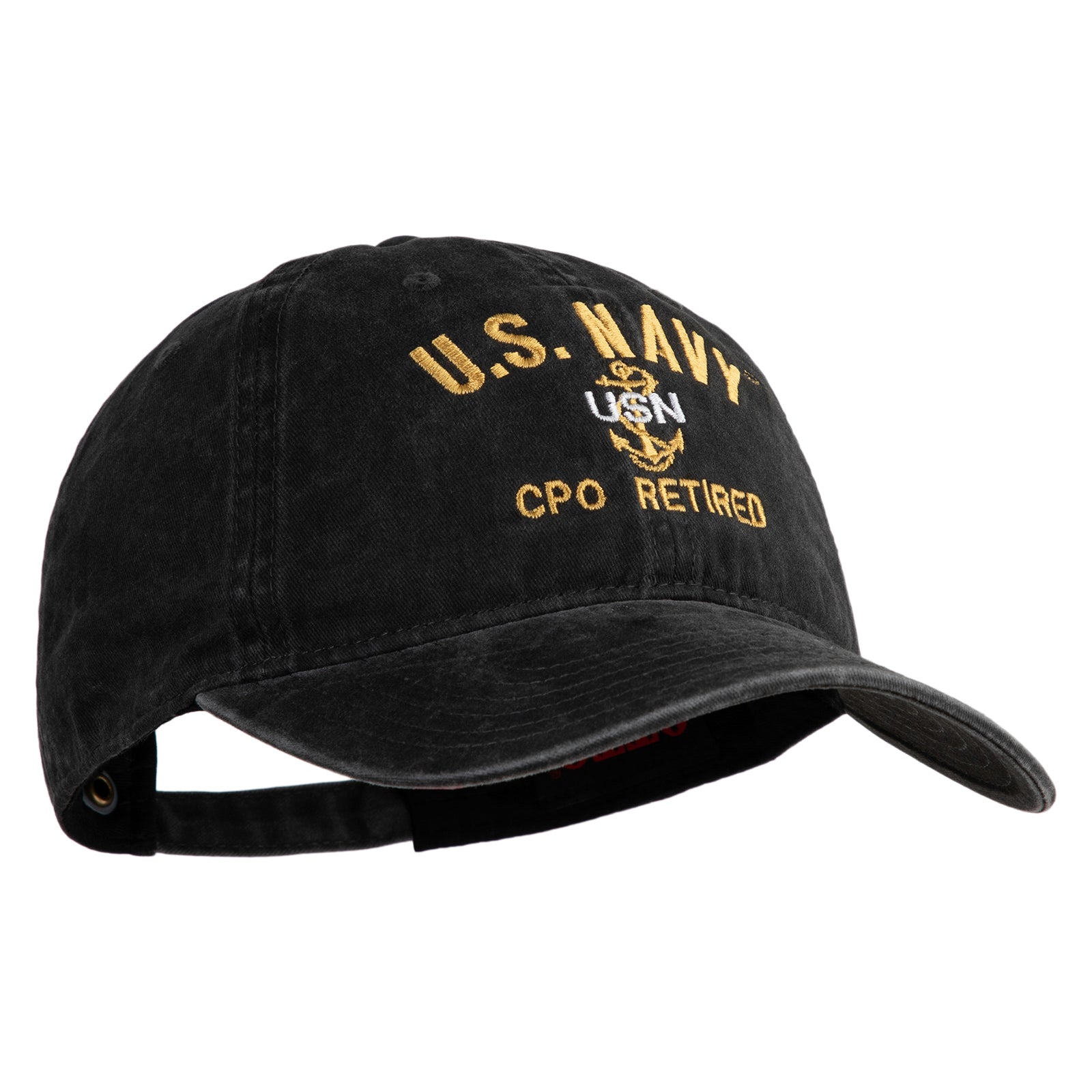 Title, US Navy CPO Retired Military Embroidered Washed Solid Pigment Dyed Cotton Twill Brass Buckle Cap