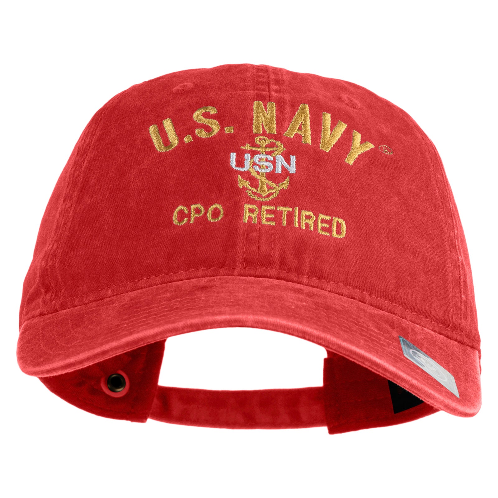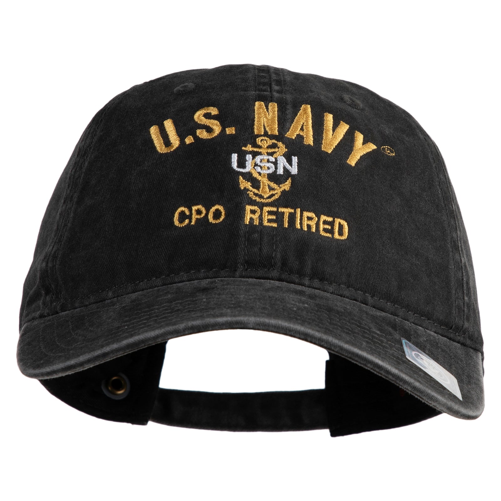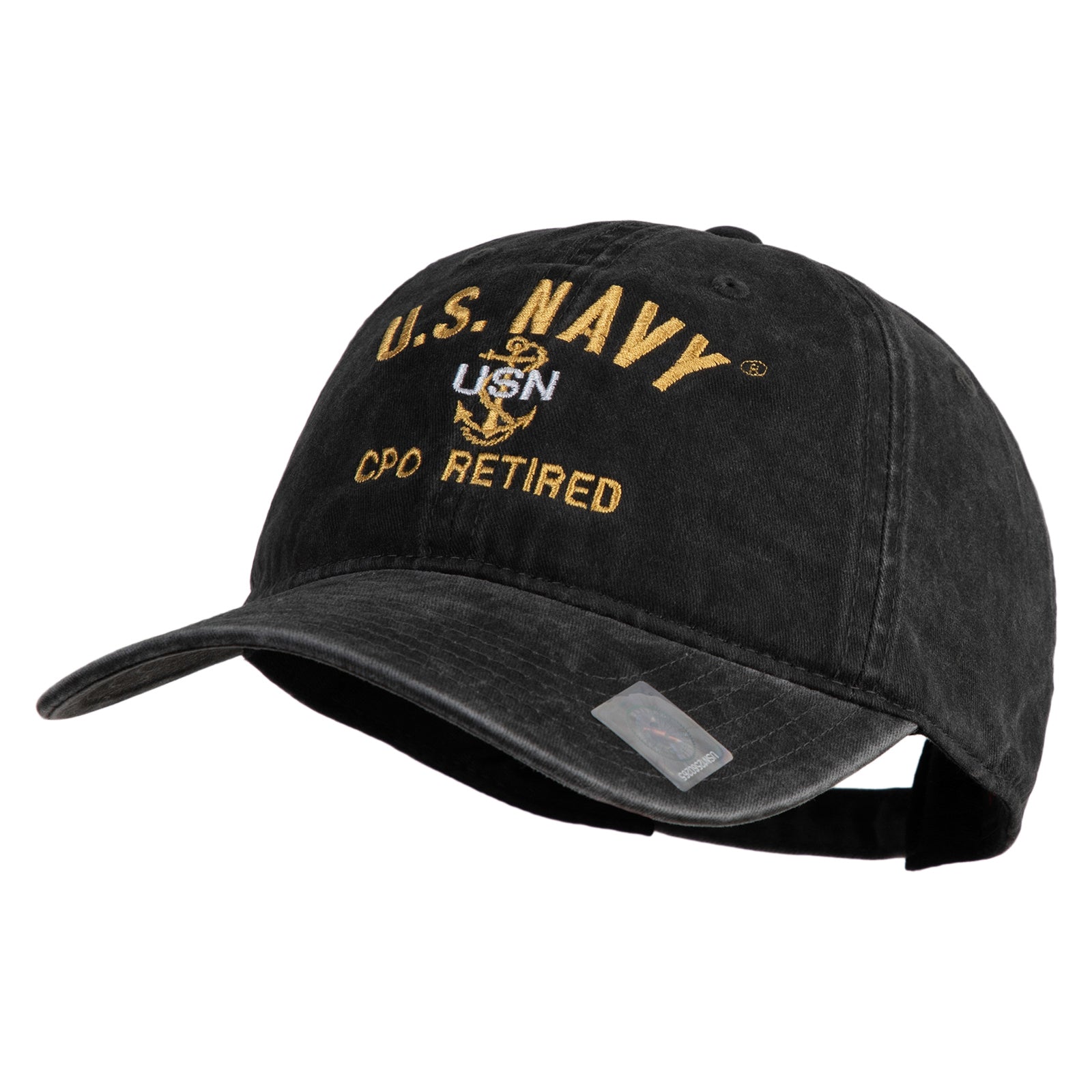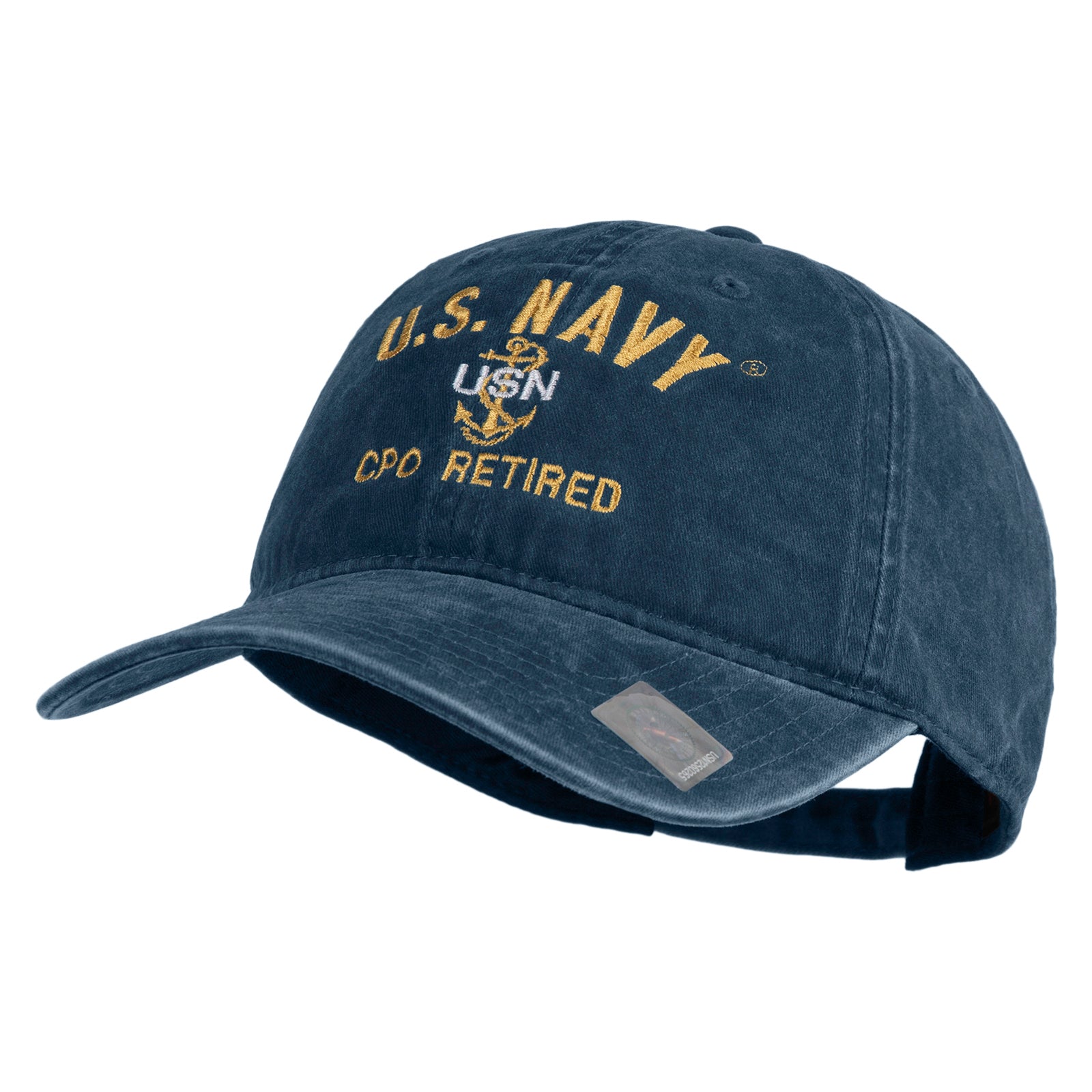 Title, US Navy CPO Retired Military Embroidered Washed Solid Pigment Dyed Cotton Twill Brass Buckle Cap