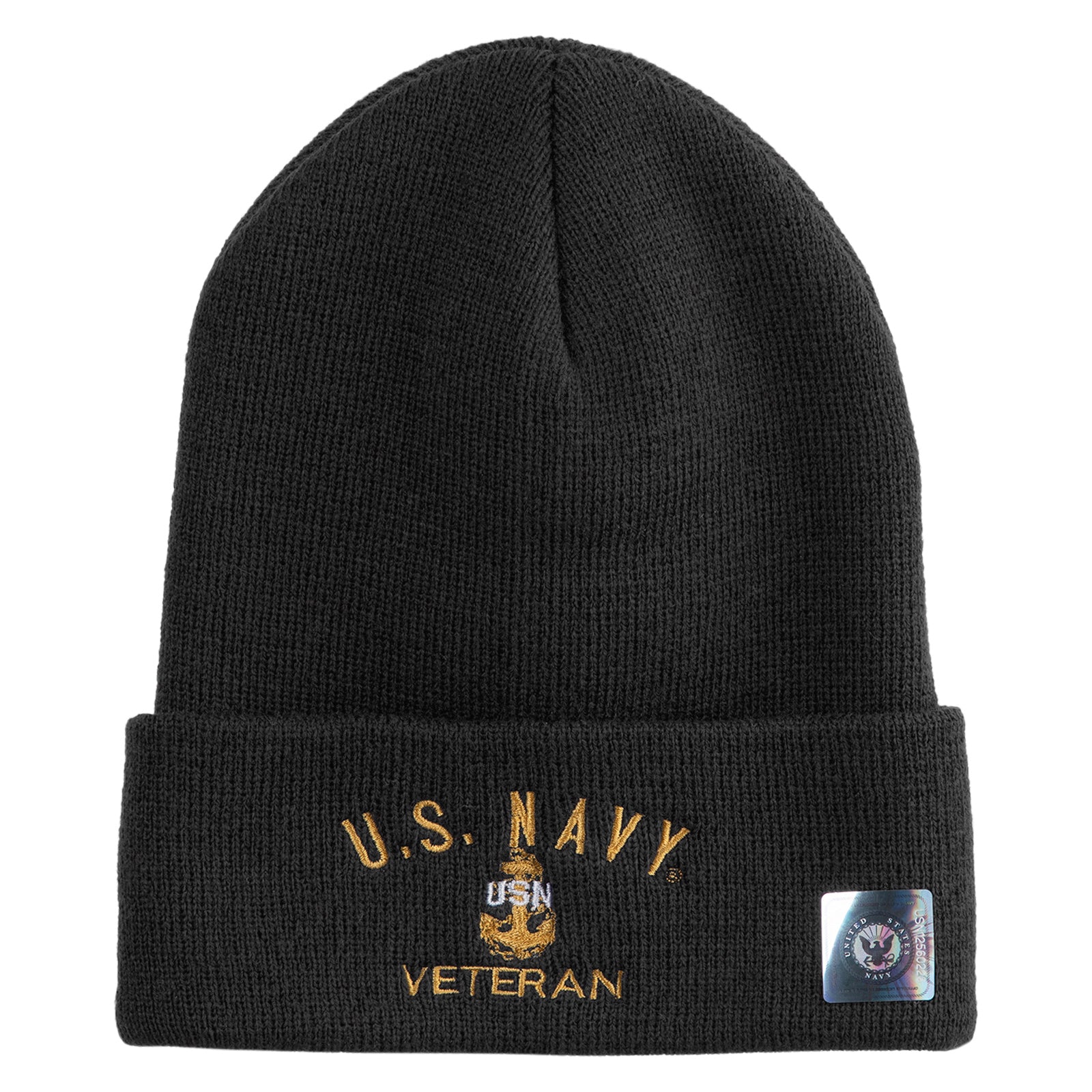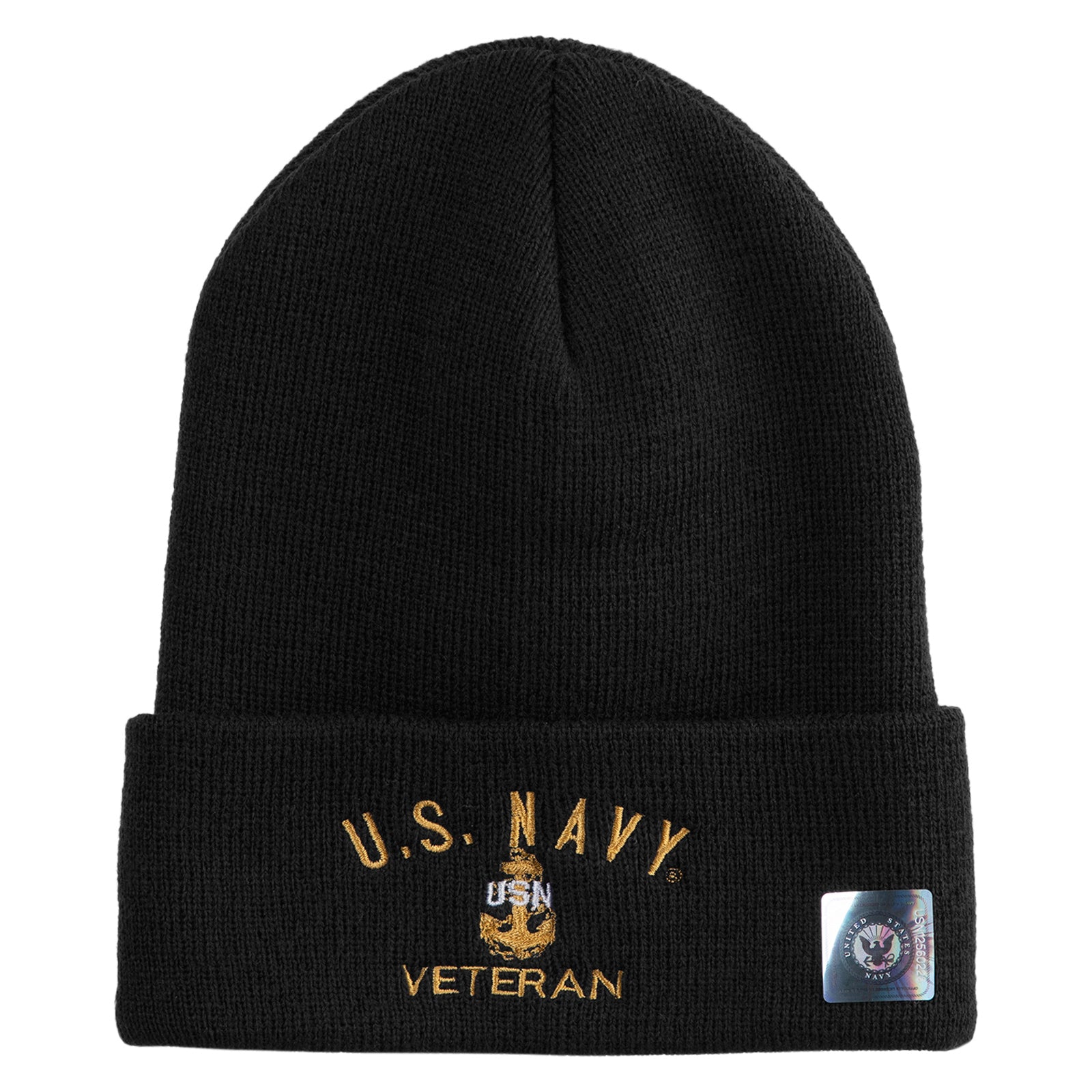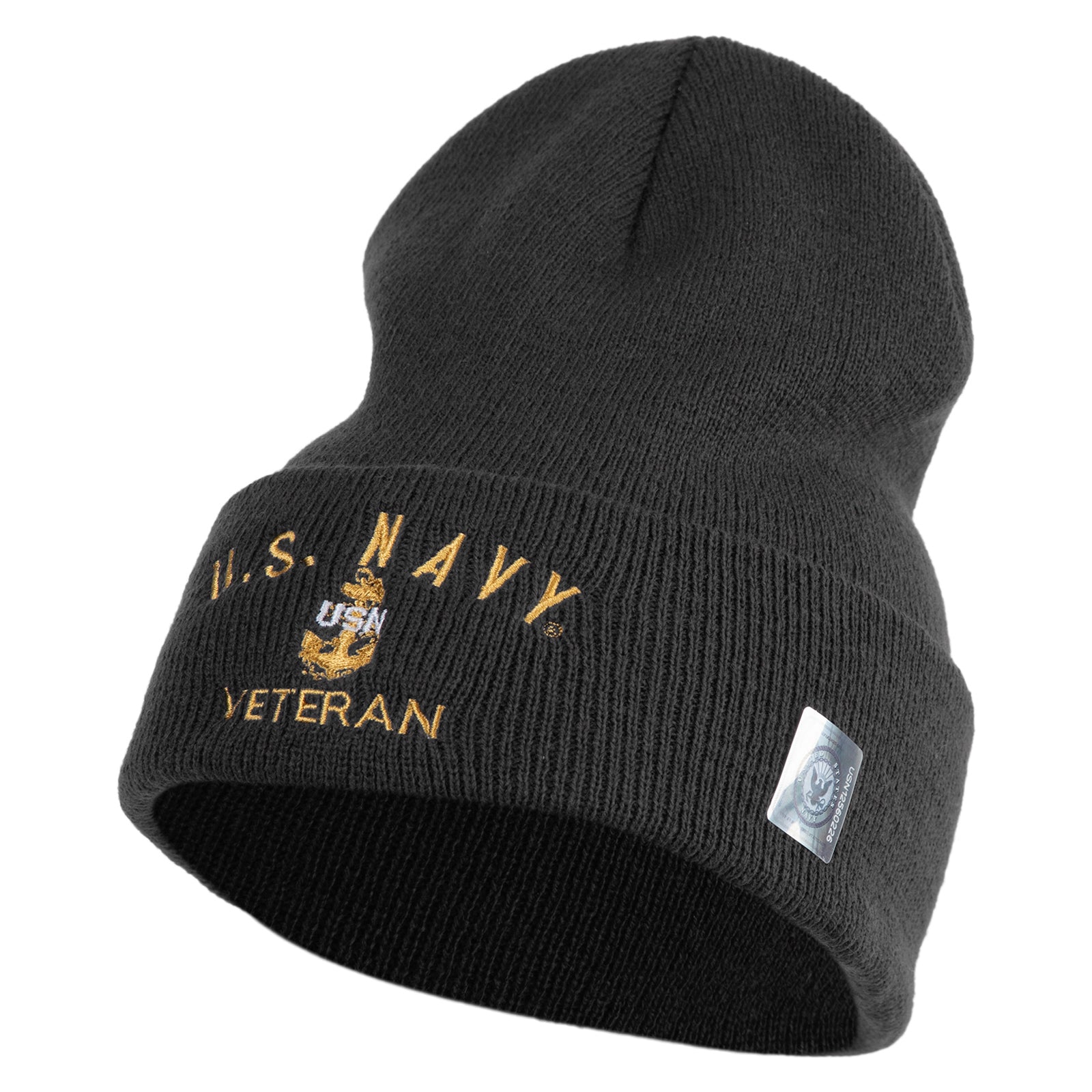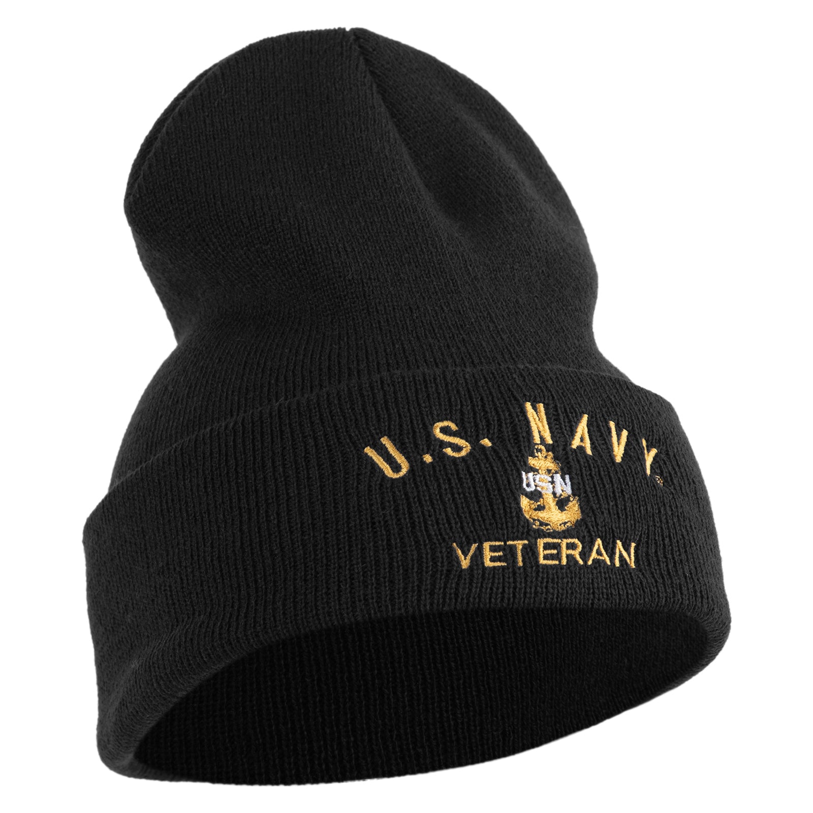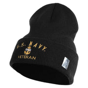 Navy USN Veteran Logo Embroidered 12 inch Cuffed Knit YP Long Beanie - Black OSFM