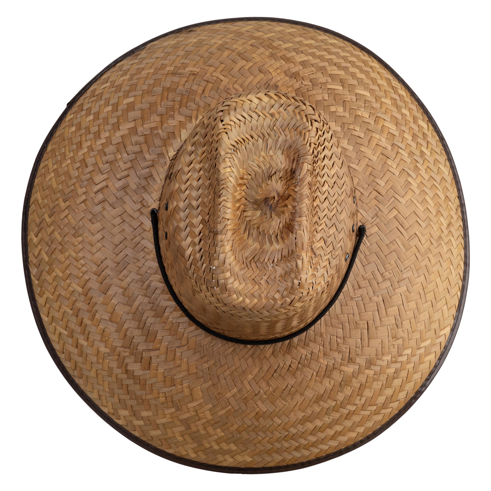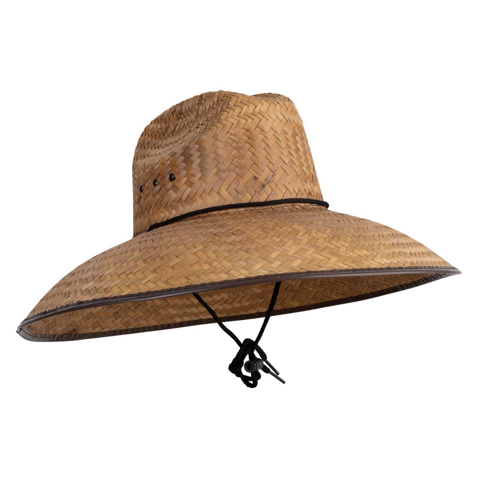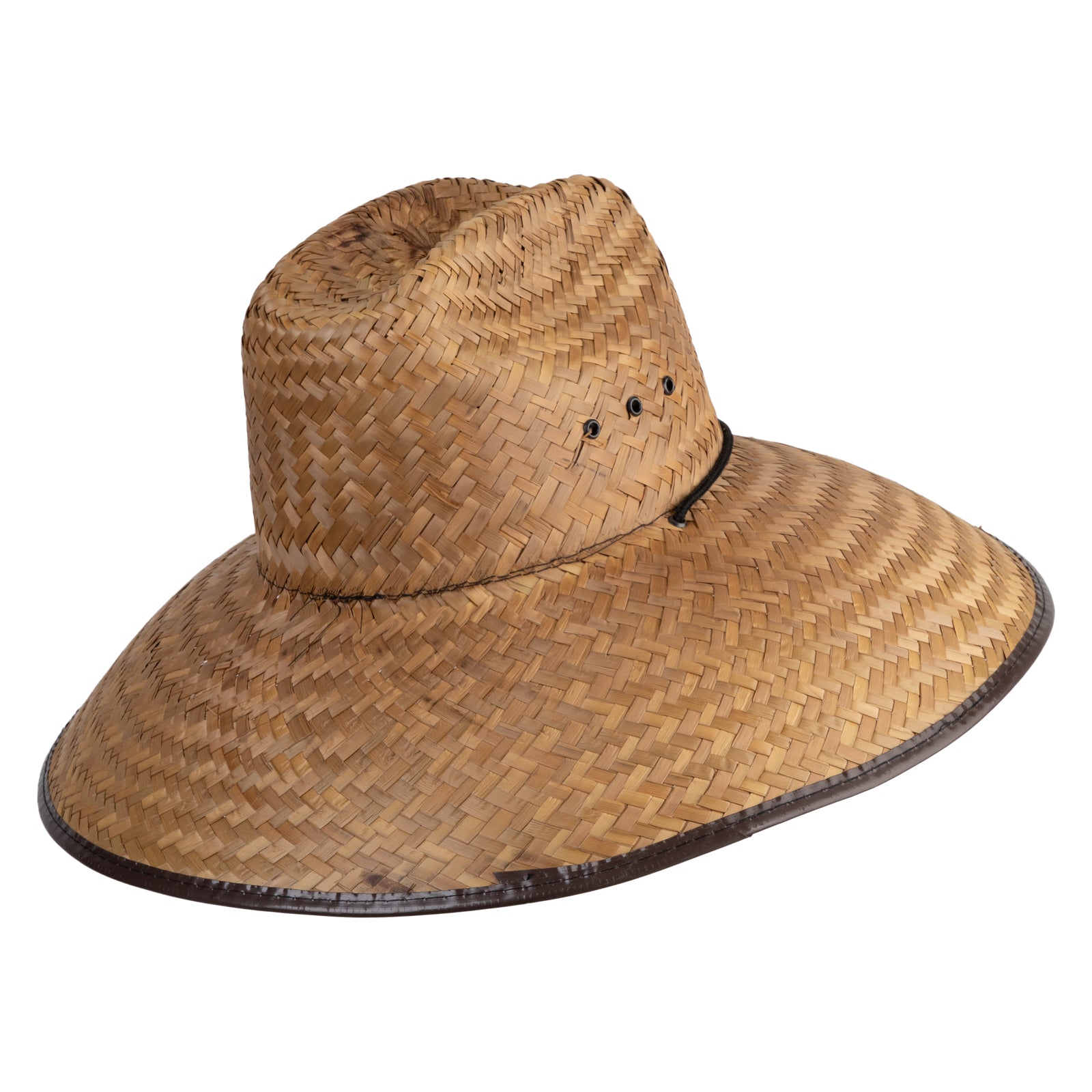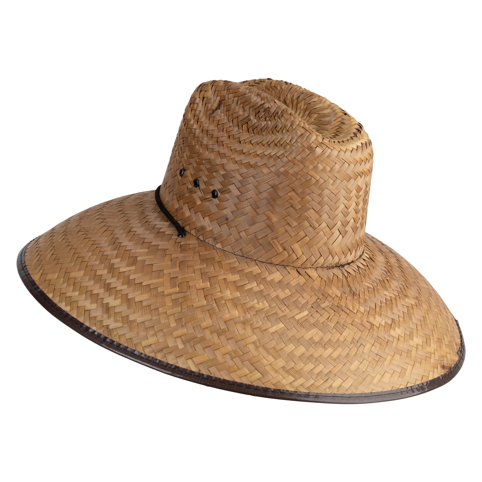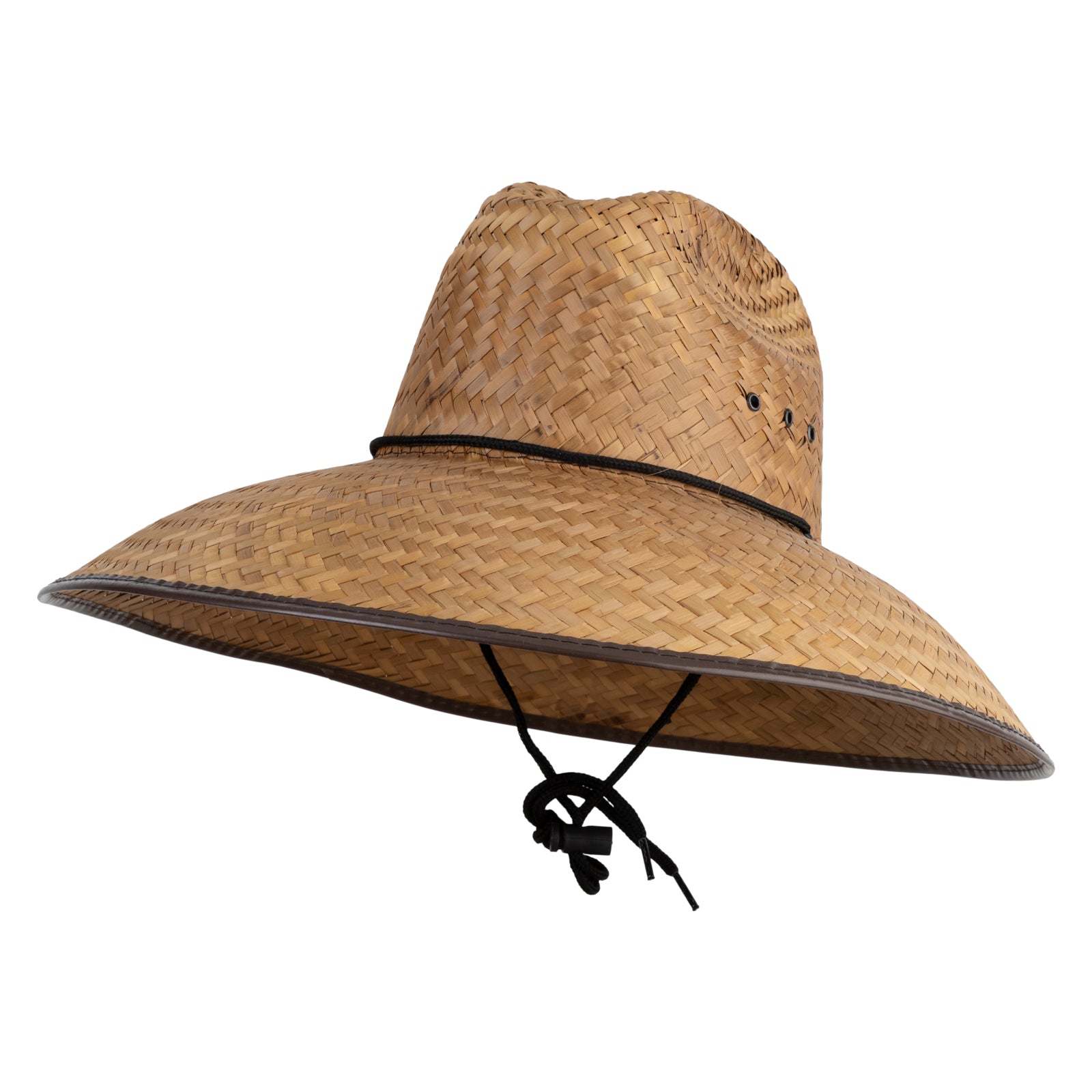 Style, Lifeguard-style straw hat with wide, downturned brim.